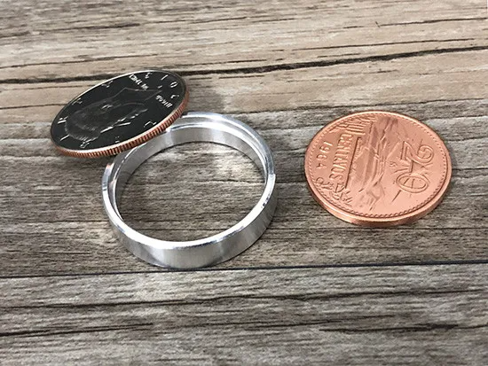 The magician shows a US half dollar and a mexican coin in the left hand. He closes both hands and when he opens the left only the half dollar can be found because the mexican coin has appeared in the right hand!